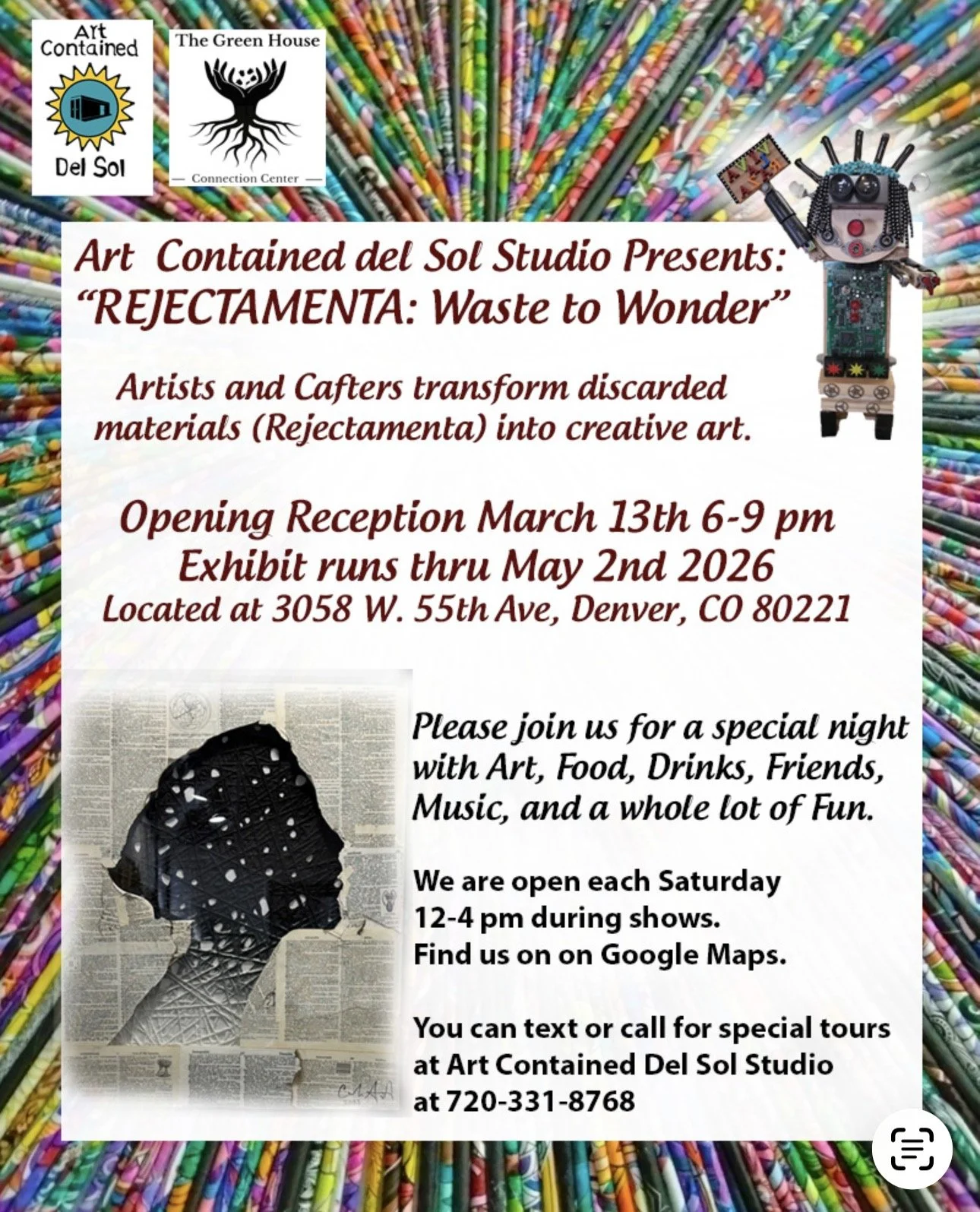 Join us for an evening of music, light snacks, and good company as we celebrate the opening of our first art show of the year — REJECTAMENTA: Waste to Wonder. Bring a friend and enjoy a lively Friday night connecting with artists, neighbors, and the local art community.
